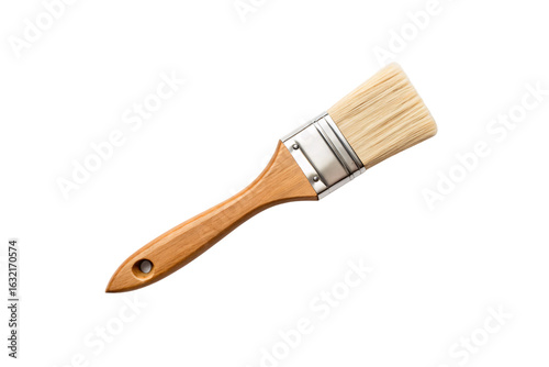 Wide paintbrush with natural bristles, metal ferrule and wooden handle with hanging hole, isolated on a transparent background