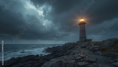 Wide Shot of Solitary Lighthouse Standing Against Turbulent Sea and Brooding Cloudy Sky, Warm Light and Jagged Rocks, Daytime