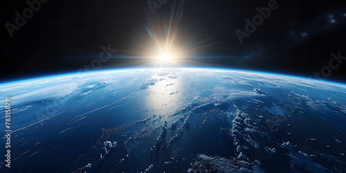 wide shot of the earth from space, blue horizon, black sky, bright sun in upper left corner, cinematic