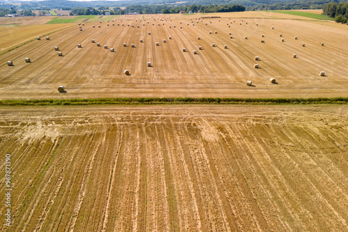 Wide view of a field with neatly arranged round straw bales, captured from an aerial perspective, showcasing the orderly post-harvest scene.
