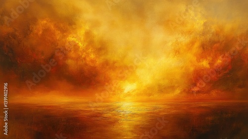 Wide view of the sea beneath an intense fiery sunset sky with golden reflections on the surface