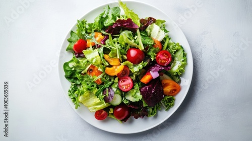 Wide-angle shot of a fresh, colorful salad with a variety of greens, crunchy vegetables, and a hint