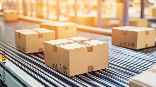 wide-angle view of a distribution warehouse conveyor belt loaded with cardboard boxes, symbolizing e-commerce efficiency. the organized layout emphasizes the modern logistics landscape