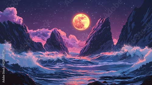 Wide-angle view of glowing cliffs surrounded by crashing waves illuminated by a full moon, cinematic dramatic tension