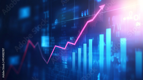 Widescreen Abstract financial graph with uptrend line arrow and bar chart of stock market on blue color background.