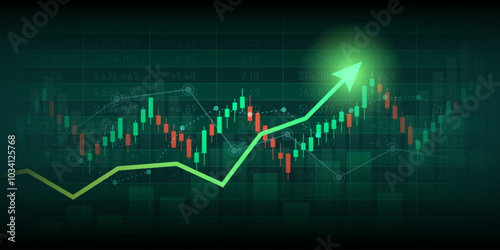 Widescreen Abstract financial graph with uptrend line arrow and bar chart of stock market on green color background
