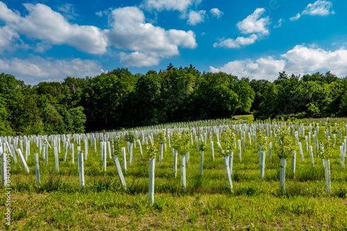 Wiederanpflanzen von jungen Laubbäumen in Wuchshüllen
