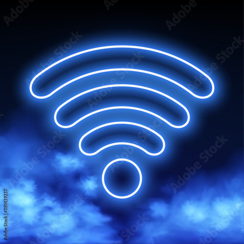Wifi Symbol with Blue Glowing Light Effect: Futuristic Wireless Networking, Radar, and Signal Sensor Wave Connection Concept with Blue Neon Smoke Glow. Vector.