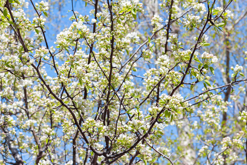 Wild apple tree in blossom on blue background. Apple blossoms are slightly open.