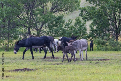 Wild burros with foals in a meadow