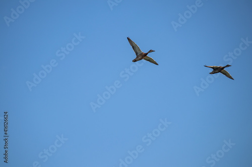 Wild ducks on a background of blue sky. Two blurry ducks in flight. Hunting concept.
