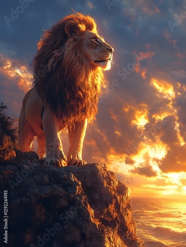 Wild Majestic Lion Animal on a Cliff Coastal Scenery