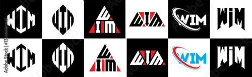 WIM letter logo design in six style. WIM polygon, circle, triangle, hexagon, flat and simple style with black and white color variation letter logo set in one artboard. WIM minimalist and classic logo