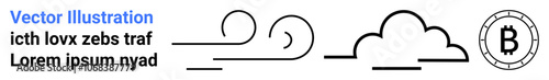 Wind lines, cloud shape, and Bitcoin symbol in fusion with text elements. Ideal for cryptocurrency, fintech, weather apps, cloud storage, digital currency, minimalist designs, and branding. Landing