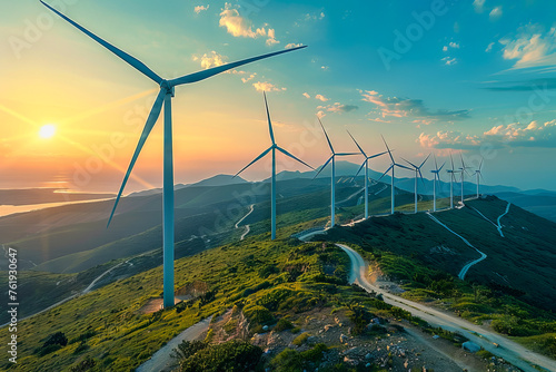 Wind power plant and technology. Smart grid. Renewable energy. Sustainable resources.