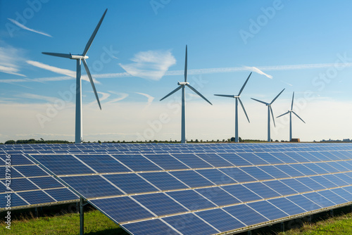 Wind turbine energy generators on wind farm, with solar panels underneath.