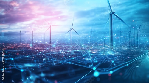 Wind turbines against a sunset sky, with a network of lights and lines overlaid, symbolizing the future of clean energy and a connected world.