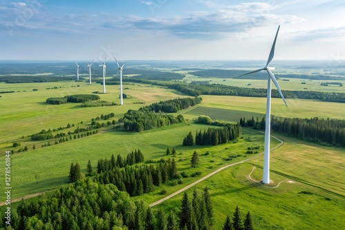 Wind Turbines Generating Renewable Energy in a Green Field Landscape