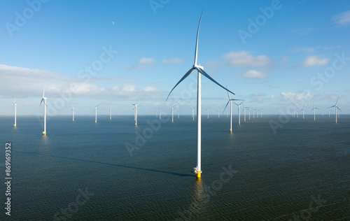 Wind turbines in Ijsselmeer lake under cloudy sky