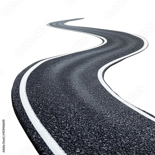 Winding curved road isolated on white background, showcasing a double white line and asphalt texture, symbolizing journey and direction.