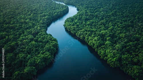 Winding River Through Lush Forest, an expansive aerial perspective showcasing a meandering river surrounded by vibrant green foliage, highlighting nature's intricate beauty.