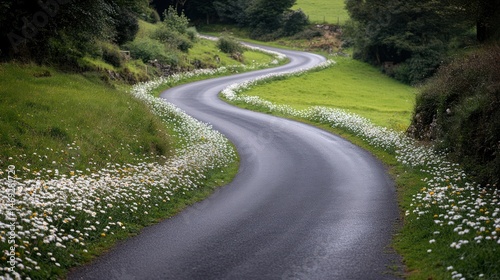 Winding Road Through Countryside, Leading to a Green Valley, Perfect for Travel and Scenic Background