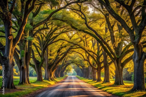 Winding tar seep path surrounded by a canopy of towering oak and maple trees casting dappled shadows on a rural street.