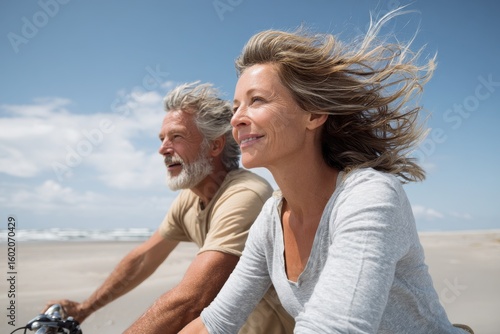 Windy Couple. Mature Caucasian Adult Woman and Man Enjoying Bike Ride on Beach Holiday