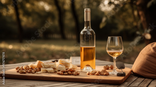 Wine Cheese and Nuts on Wooden Board in Outdoor Setting
