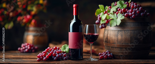 Wine bottle and grapes on rustic table. Red wine bottle stands next to a glass with grapes on a wooden table, surrounded by barrels and autumn leaves.