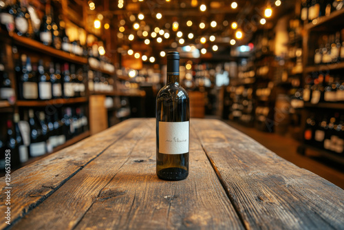 Wine Bottle on Wooden Table with Blurred Wine Shop Background