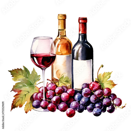 Wine bottle, wine glass, grape watercolor style with transparent background