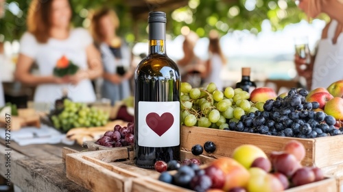 Wine bottle with heart label and fresh fruit display at outdoor gathering