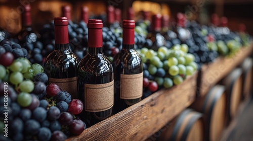 Wine bottles and fresh grapes on a rustic wooden shelf