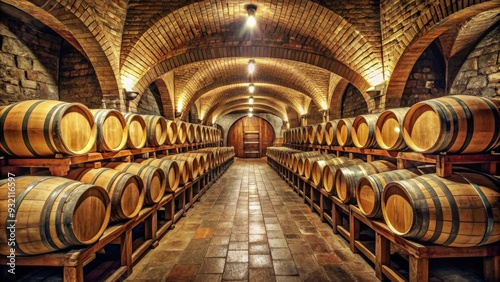 Wine Cellar with Wooden Barrels, Brick Arches, and Tile Floor, wine cellar, wine barrels, brick arches, tile floor