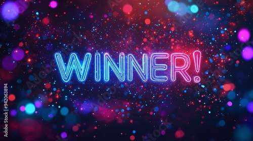 Winner! neon text with glitch and motion blur effects background. Winner! neon design for digital games.