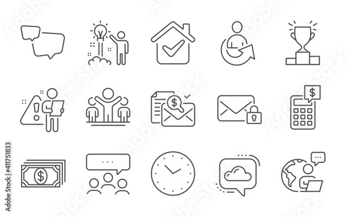 Winner podium, Calculator and Speech bubble line icons set. Creative idea, Winner and Secure mail signs. Payment, Accounting report and Cloud communication symbols. Share, Time and Meeting. Vector