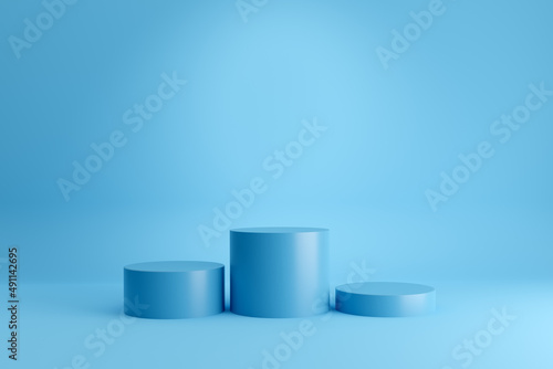 Winners podium or pedestal with empty cylindrical platforms on blue background.