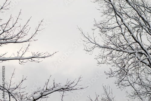 winter background, photo of snowy tree branches and gray sky in winter view from below