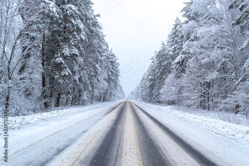 winter day in the forest, trees covered with snow, the sky is visible, snow-covered asphalt road goes deep into the forest
