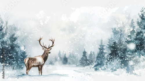 Winter forest with deer and snow in tranquil shades of white and gray, watercolor frame with white empty space for text in the center isolated on a white background
