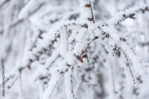 Winter frost branches snow and ice covered. Winter background.