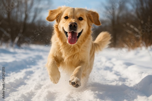 Winter Joy - Playful Golden Retriever Running Through Fresh Powder Snow with Pure Happiness