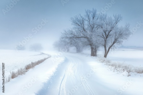 Winter landscape featuring a snowy road with frosted trees in a quiet, misty atmosphere