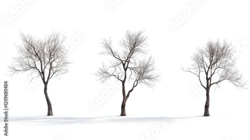 Winter landscape featuring three bare trees standing alone in a snowy white background showcasing the beauty of solitude in nature.