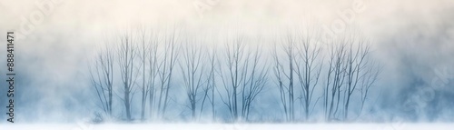 Winter landscape with bare trees enveloped in fog and mist, creating a serene and tranquil atmosphere.