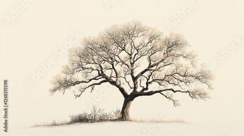 Winter oak tree landscape, serene field background, nature illustration, calm design