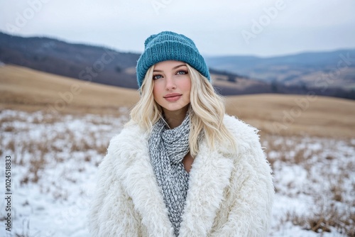 Winter portrait of a beautiful blonde woman with snow in the background.