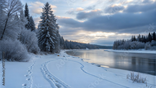 Winter River, a scene of a frozen river with animal tracks walking along it