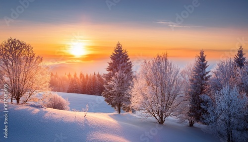 winter s embrace a breathtaking winter landscape where frost covered trees stand gracefully against the backdrop of a vibrant sunrise creating a scene of tranquil beauty and cold
